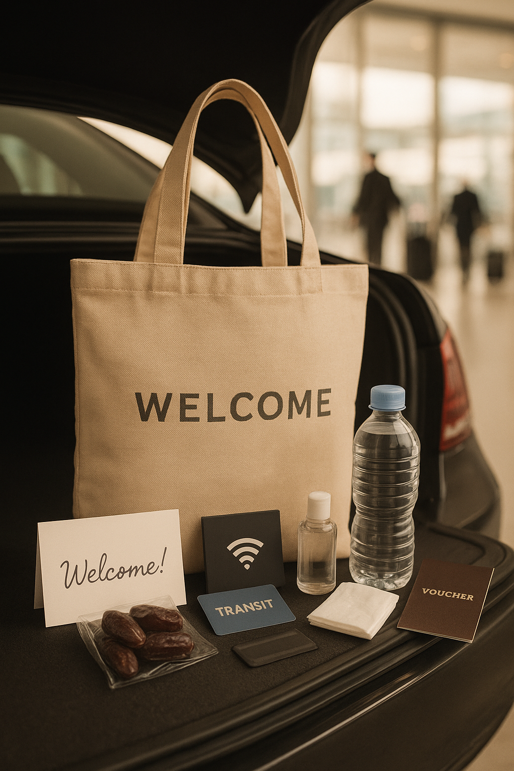 A premium welcome package handed to visitors upon airport pickup (by a driver/tour rep), designed to make their transition smooth, comfortable, and instantly delightful.